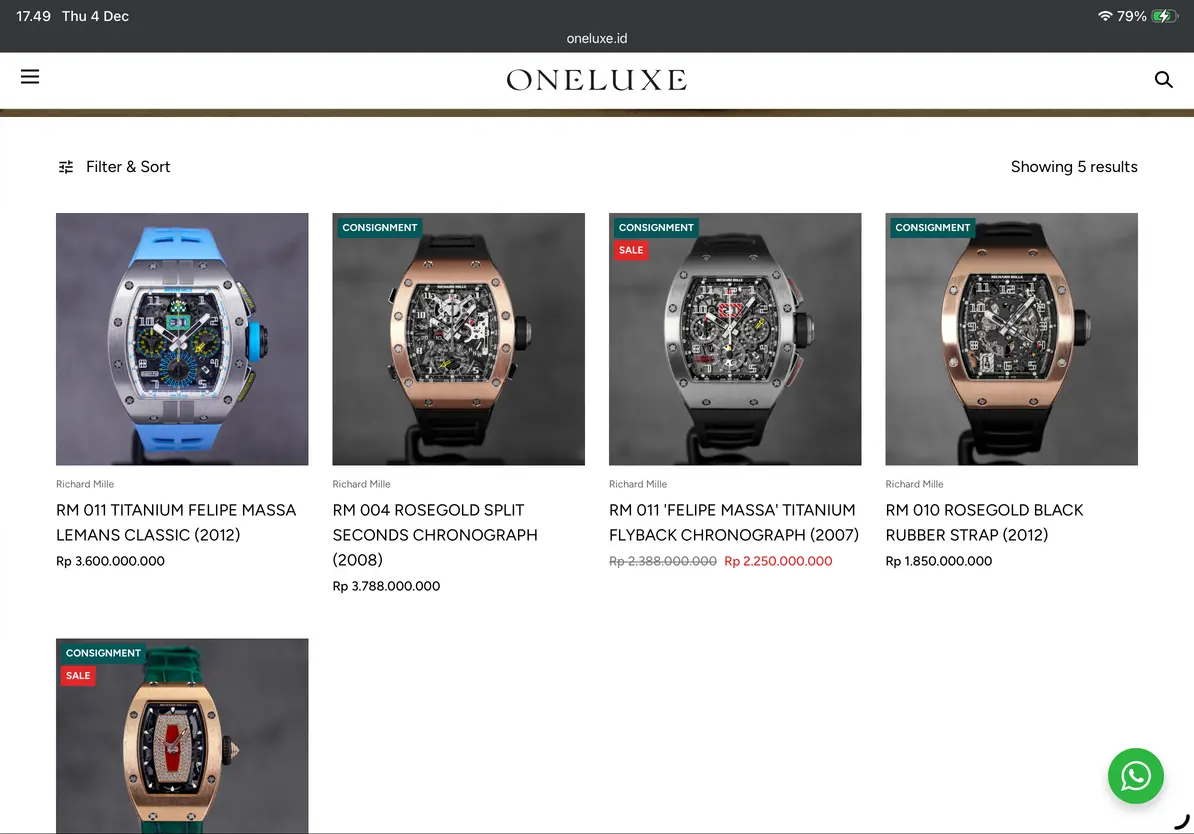 Selain Richard Mille, ONELUXE juga menghadirkan berbagai merek blue-chip lainnya seperti Patek Philippe, Audemars Piguet, dan Rolex.