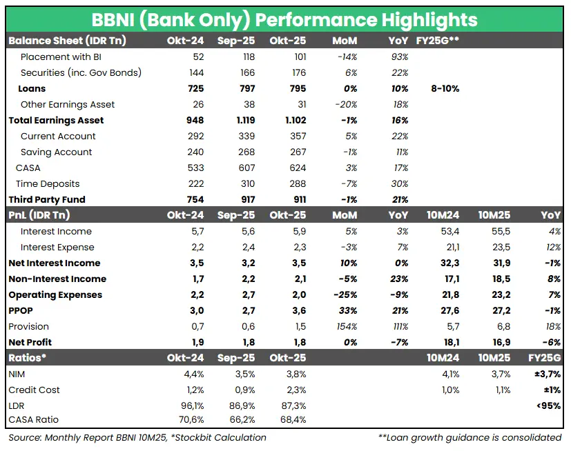 • Loans (Kredit): Pertumbuhan kredit BBNI menunjukkan stagnasi pada basis bulanan (MoM 0%) di Oktober 2025 (Rp 795 Triliun), namun secara tahunan masih tumbuh signifikan (YoY 10%). Angka ini berada dalam target panduan FY25G (8-10%).
