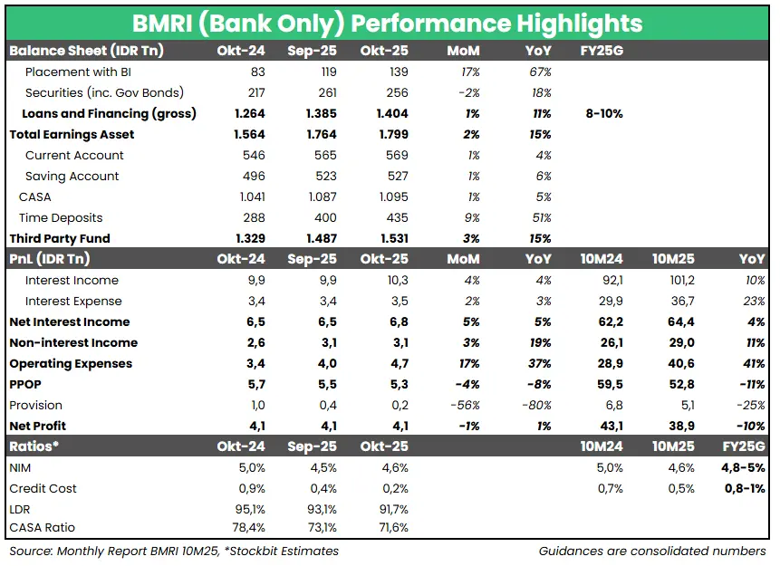 • Credit Cost: Menurun dari 0,9% (Okt-24) menjadi 0,2% (Okt-25), jauh di bawah BBNI dan rata-rata 10M25 (0,8%), mengindikasikan kualitas aset BMRI yang lebih baik (risiko kredit lebih rendah) untuk periode ini.