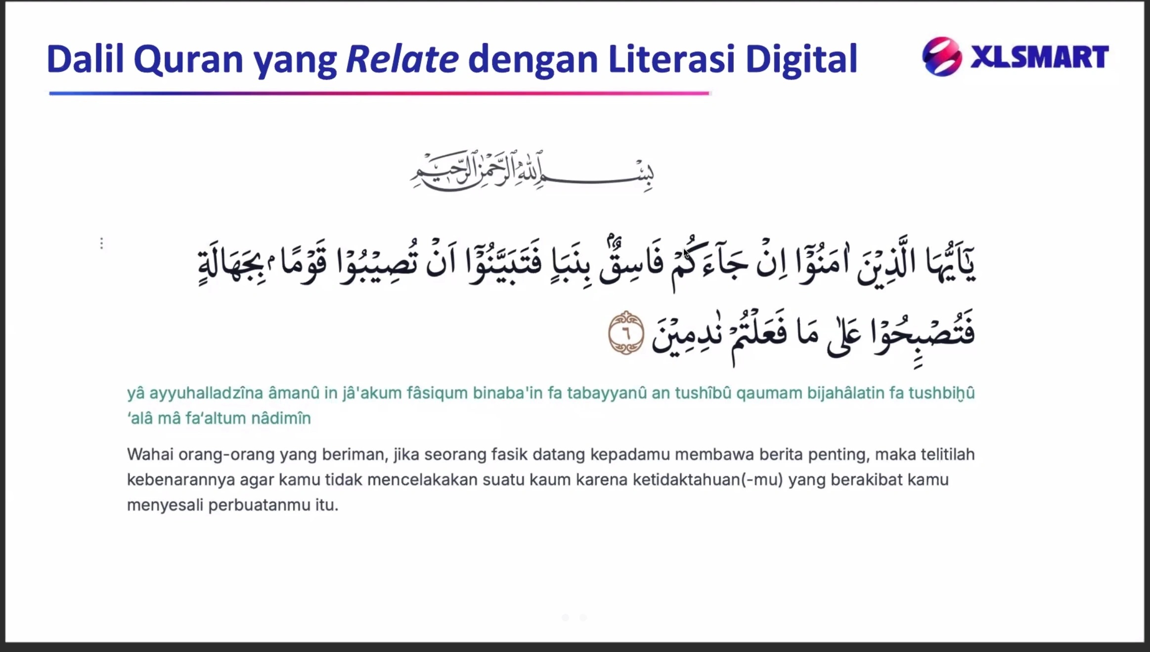 Dani pun memperlihatkan dalil Al Quran yang berhubungan dengan literasi digital. Nggak nyangka, ternyata ada loh. Wah aku kurang telaah Quran lagi nih. Dani pun yakin dalil yang relate dengan literasi digital ini juga ada di kitab-kitab suci agama lain. Yakni ajaran untuk berbicara yang positif.